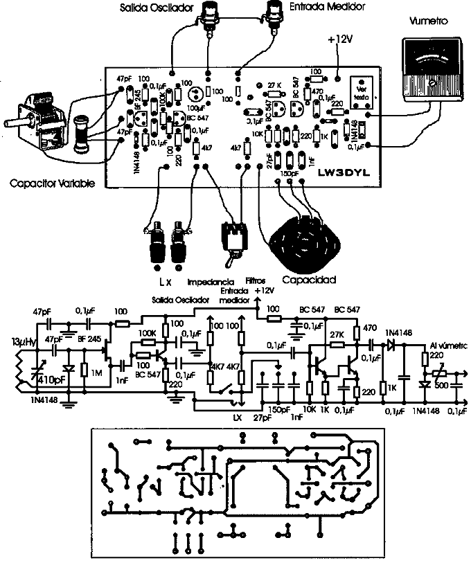 Antes de comenzar a construir equipos de radio es necesario desarrollar una serie de pequeños instrumentos que nos permitan acceder a medidas que no son posibles con un simple tester. En el artículo anterior presenté un frecuencímetro simple y económico, que puede medir con comodidad hasta más de 30 MHz. En este artículo explico cómo construir con componentes comunes un medidor de inductancias, permite fabricar bobinas para circuitos sintonizados de la mejor calidad, dado que no es posible armar buenos equipos sin buenos filtros de entrada, y para eso debemos poder medir ciertos parámetros que sin instrumental es imposible, y como el instrumental específico es caro... lo construímos y de paso estudiamos la teoría de los circuitos. Uno de los principales problemas en la construcción de equipos para radioaficionado es poder hacerlos duplicables, esto es, que así como yo lo puedo armar y calibrar en mi taller de Burzaco también debe poder hacer lo mismo un estudiante de Córdoba o un aficionado de Rosario. Es por eso que utilizo para mis proyectos transistores e integrados comunes y corrientes, fácilmente asequibles en todas partes. Pero mis buenas intenciones chocan contra una pared al momento de fabricar una bobina. Normalmente puedo decir “15 espiras de alambre de 1mm sobre forma de 5/8 de pulgada” y pienso que todo el mundo la va a poder hacer, pero... ¿y si tengo una forma distinta?, ¿y si tengo un alambre diferente? ¡Y no hablemos de bobinar sobre ferritas o toroides! En esos componentes la disparidad de características es enorme. ¿Cómo puedo superar este escollo? Simple: en todos mis circuitos doy el valor de la inductancia, sólo tenemos que construir este simple inductámetro, que además funciona como generador de RF (radiofrecuencia) y calibrador de filtros de entrada, conseguir una forma, un poco de alambre, bobinar, medir y listo, ya tenemos una de las partes más delicadas del equipo en condiciones. Aclarado este punto importantísimo, pasaremos a una breve revisión sobre bobinas y circuitos sintonizados. Tomemos como ejemplo el circuito de la figura 1. Allí observamos un oscilador acoplado a una bobina de 10 uHy por medio de un resistor de 10K y a un condensador de 47 pF en paralelo con ésta. A su vez todo el conjunto está acoplado a un voltímetro de radiofrecuencia que sirve para medir la tensión presente en los extremos del circuito. Si hacemos correr el oscilador desde, digamos 1 MHz hasta 15 MHz (lo pueden hacer con el Bode Plotter del Workbench) observaremos que la tensión hace un pico en la zona de los 7.5 MHz. Esto quiere decir que una emisora en esa frecuencia va a generar más tensión que una supongamos en 1.4 MHz u otra en 14 MHz. Esto hace que escuchemos una frecuencia (la de sintonía) y no todas las demás. Este pico de tensión se conoce como resonancia del circuito y puede calcularse con la fórmula: F: 1.000 6.28 raiz cuadrada deLC F: en MHz L: en µHy C: en pFAhora bien, si queremos escuchar una emisora en una frecuencia determinada y no otras calculamos un circuito sintonizado de éstos y ya está... Pero no todo es tan fácil. Veamos algunos detalles: Si aplicamos una frecuencia de 7.5 MHz con el oscilador a una amplitud de 10V obtenemos en el voltímetro una lectura de unos 5.5 Vp (de pico). Si nos desplazamos hasta los 5.1 MHz o los 10.7 MHz la tensión cae a la décima parte (unos 0,55Vp). Estos son los puntos de –20dB (la tensión cae 10 veces), una emisora de 1KW en 5,1 MHz se escucha 10 veces menos fuerte que una de 7,5 MHz. Si nos alejamos a 2 MHz tendremos apenas 0,135Vp y en 15 MHz 0,2 Vp como muestra la figura 2. Habrán notado el detalle de que el oscilador y el voltímetro se conectan a la carga por sendas resistencias de 10K. Probemos ahora haciendo el mismo trabajo pero con resistencias de 500 ohms, de acuerdo a la figura 3. Aquí notamos que en la frecuencia de resonancia (7.5 MHz) la tensión es de 9.5 Vp pero en 5.1 MHz y en 10.7 MHz ya no es 10 veces menor, sino que es ahora de 7.5 Vp. Los puntos de –20 dB están ahora en 750 KHz y en 65 MHz, con 0,96Vp. Como vemos en la figura 4, este circuito no es tan efectivo como el anterior, dado que es mucho más ancho. Con esto observamos que este tipo de circuitos sintonizados deben cargarse con alta impedancia para que sean efectivos y puedan discriminar eficazmente las emisoras. Comparando las dos figuras vemos que la primera es más aguda que la segunda, siendo entonces de mejor calidad para el propósito al que son destinadas. Esto se mide con el factor de mérito o factor de calidad Q. Hay que detallar que en todo circuito sintonizado, además de la inductancia y la capacidad hay también presente resistencia. Hasta más o menos los 30 MHz la resistencia se encuentra principalmente en el alambre de la bobina y en frecuencias superiores por la pérdida en el dieléctrico del capacitor, que es equivalente a una resistencia en el circuito. El Q (factor de mérito o de calidad) de un circuito es el valor de la reactancia (ya sea capacitiva o inductiva) del circuito dividida por la resistencia del mismo. Q= X/R Una forma clásica de construir una bobina con alto Q es bobinarla con alambre grueso, para que de este modo tenga menos resistencia. Pero para lograr mayor agudeza en la sintonía se utilizan bobinas con núcleo de ferrita. La inclusión de este elemento hace que aumente notablemente el factor de calidad del inductor, pero crea el inconveniente (para el que no tiene instrumental específico) que las características de la bobina varían de acuerdo a la permeabilidad del núcleo. Este último inconveniente se puede solucionar fácilmente construyendo un simple pero efectivo medidor de inductancia que ya mismo paso a describir. Descripción del circuito: En la figura 5 podemos ver el circuito completo del medidor. Este es un instrumento doble, la primera etapa es un oscilador de radiofrecuencia, que cubre aproximadamente entre los 2 y los 6 MHz, de modo 